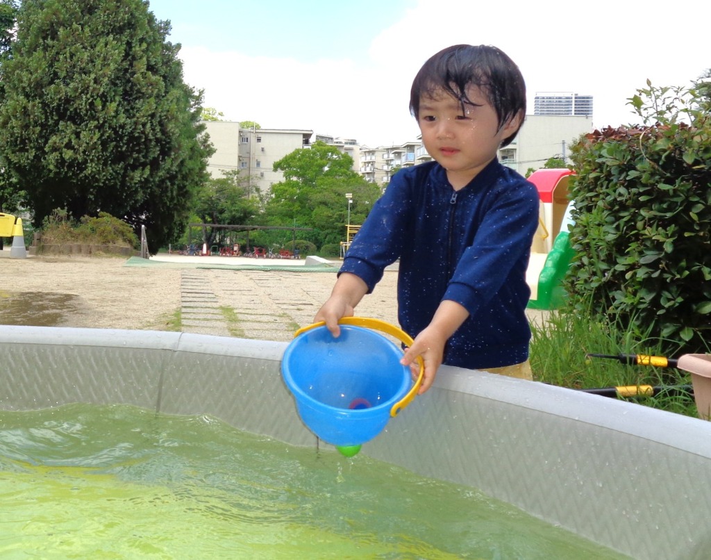 バケツで頭から水を浴びたり、友だちと水を掛け合いっこしたり