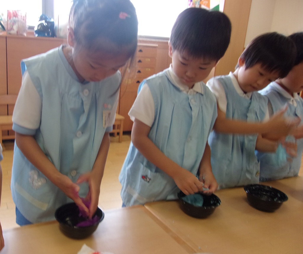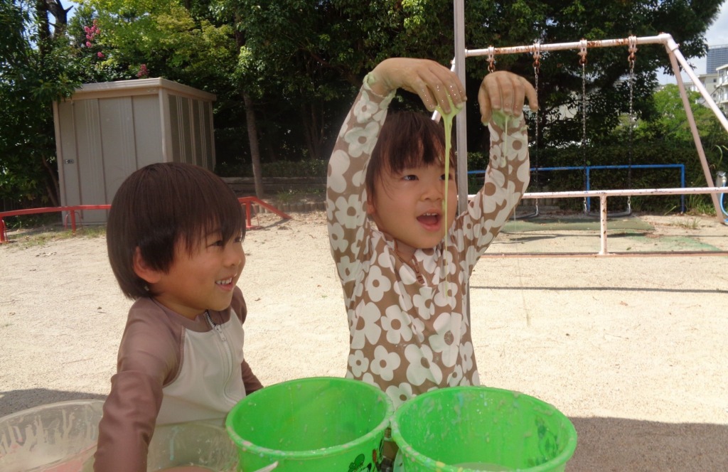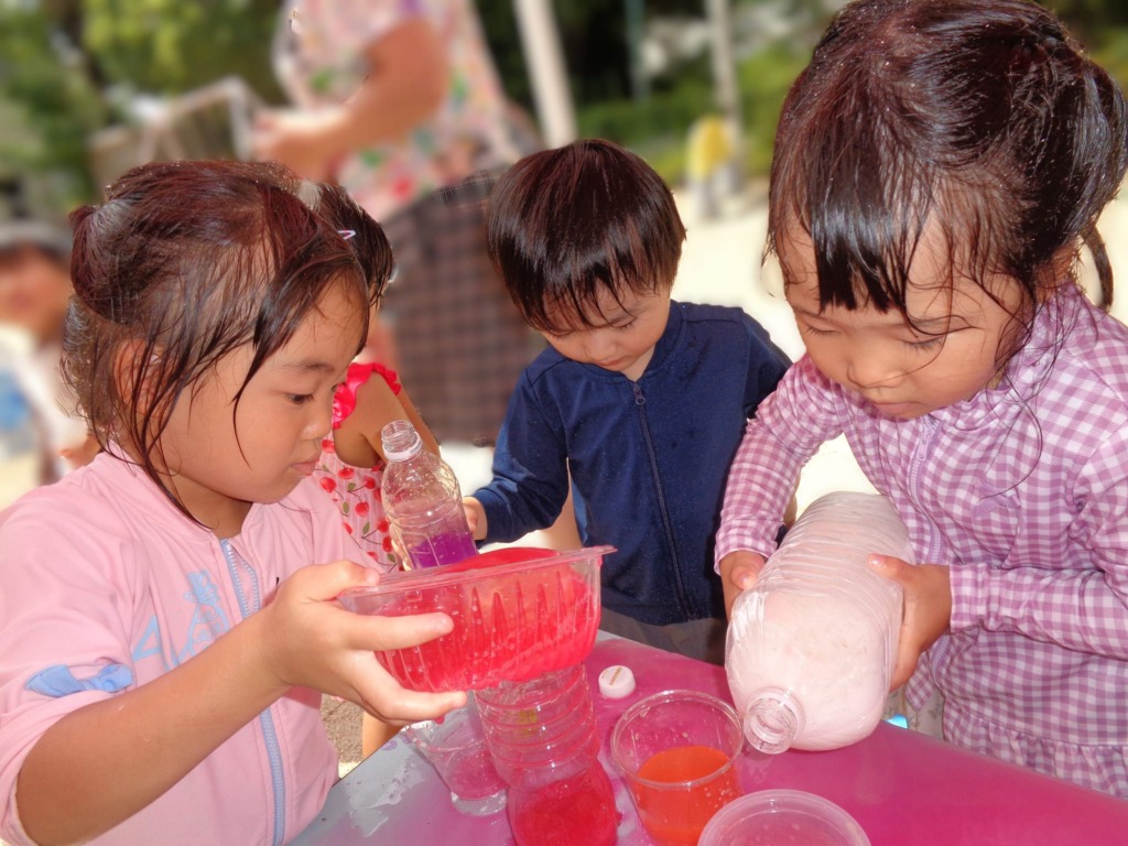 水曜日!!みなさんお久しぶりです♬夏休みいかがお過ごしでしょうか(*^▽^*)今日から3日間、夏季保育がおこなわれています!久しぶりに会うお友だちがたくさんいて、会えてとても嬉しかったです☆夏季保育は自由登園です。登園してきたお友だちは、プールに入ったり、シャボン玉や色水あそびをしたりスライムを作ったり!!!学年で楽しく過ごしていました(*^。^*)