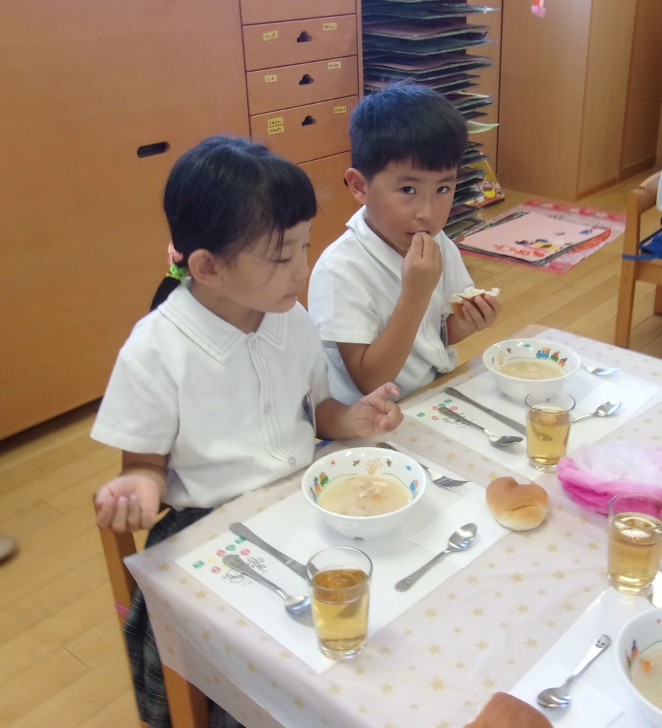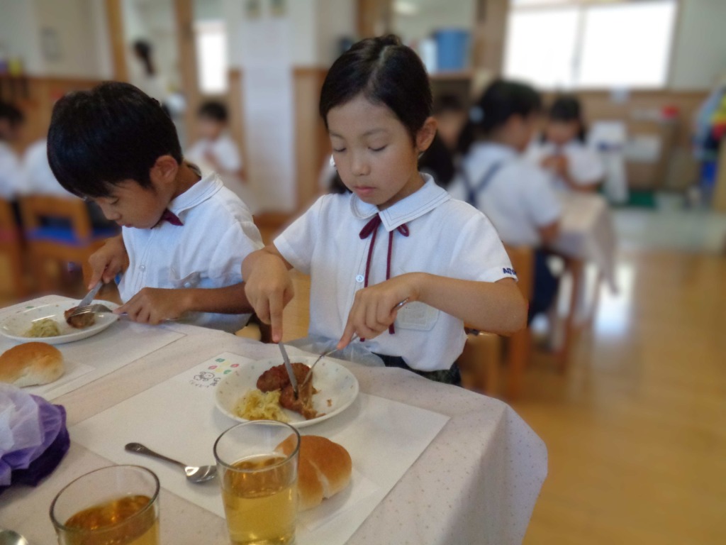 「レストランあおやまようちえん」がオープンしました(*^-^*)1学期に年長組がテーブルマナーの研修に行き、教えてもらったことを月に1度実践するのが「レストランあおやまようちえん」です☆今日は第1回目。緊張している様子も見られ、まだまだぎこちない所はあるけれど、ナイフとフォークを上手に使って食べていましたよ(*´ω`*)
