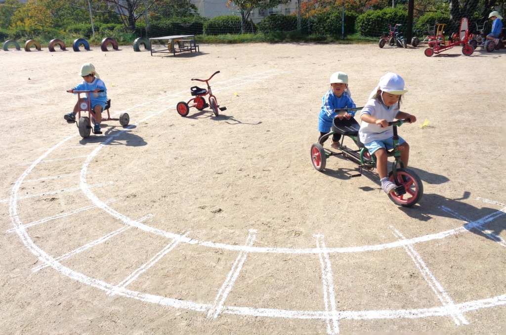 線路を描きその上を三輪車やスケーターで走りました♪