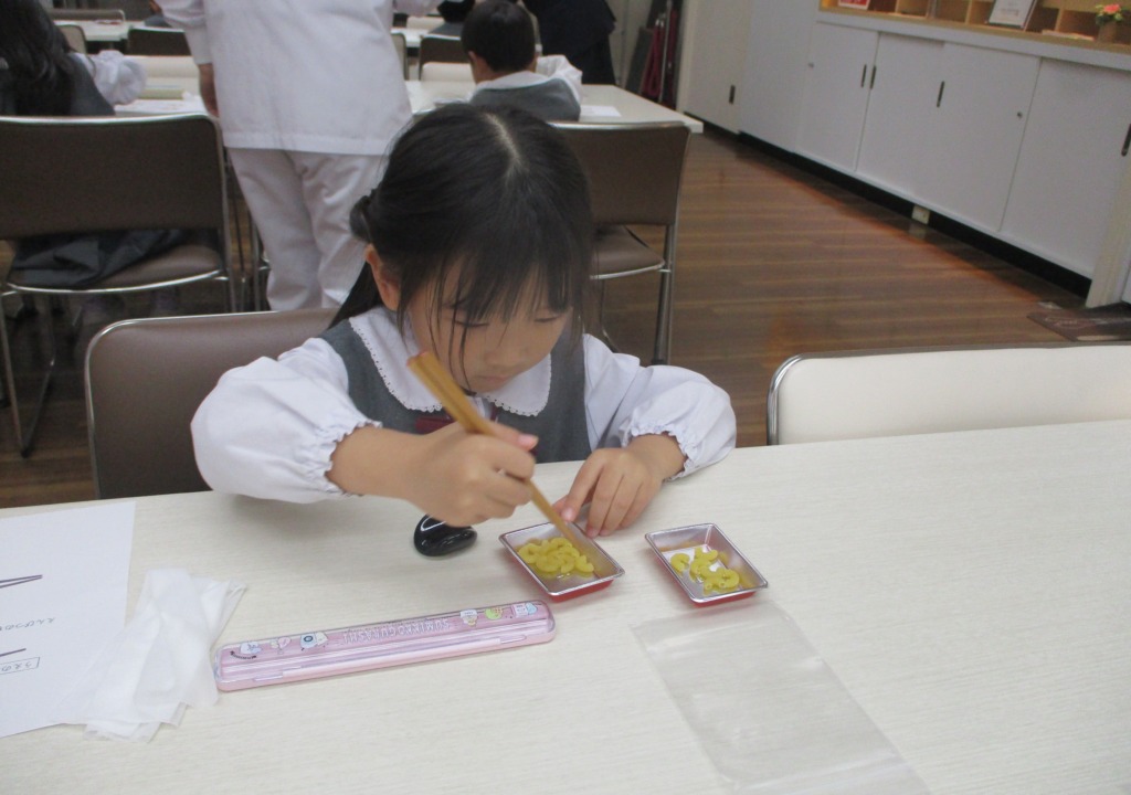 練習ではマカロニを使って、お箸の動かし方を何度も繰り返し練習しました。