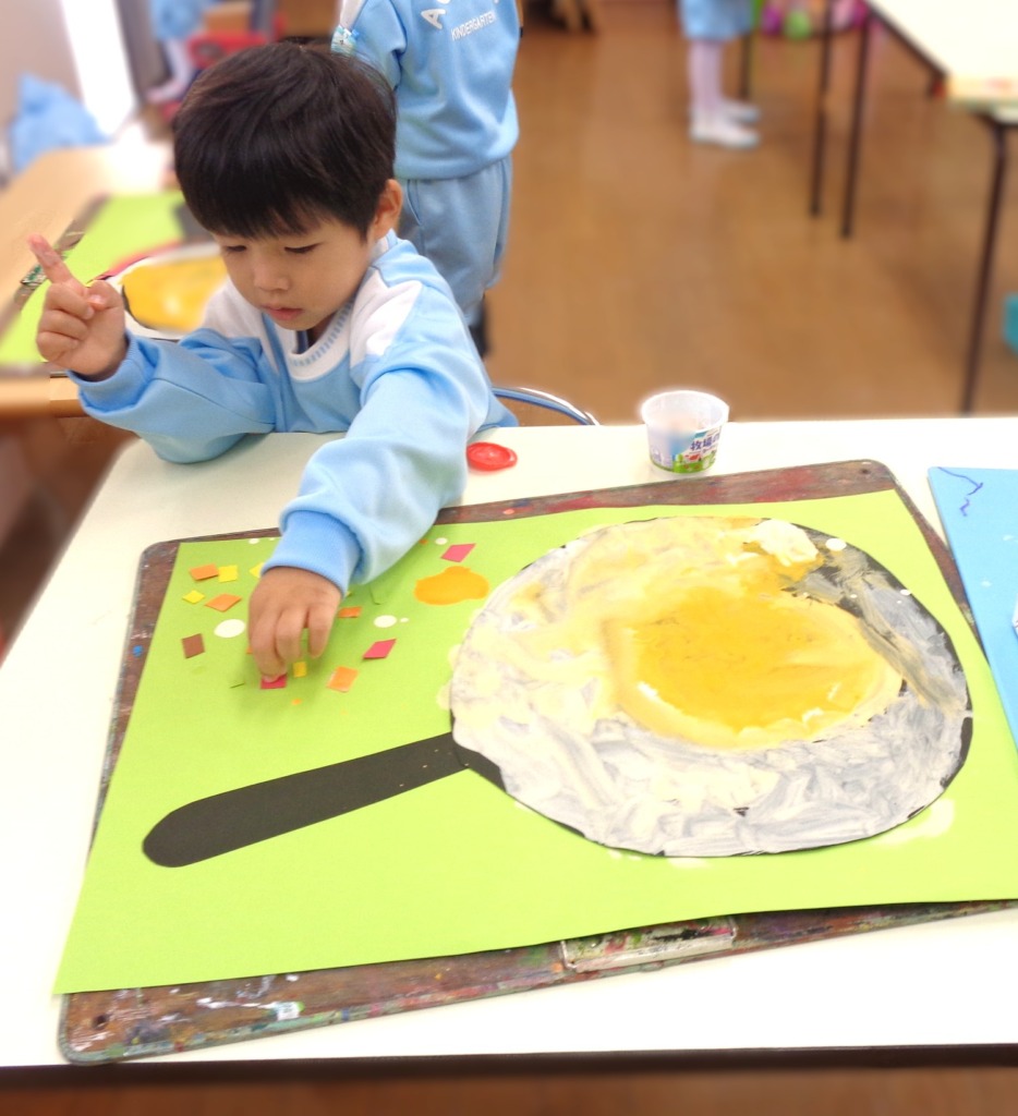 フライパンに見立てた、黒い画用紙に貼る子もいれば