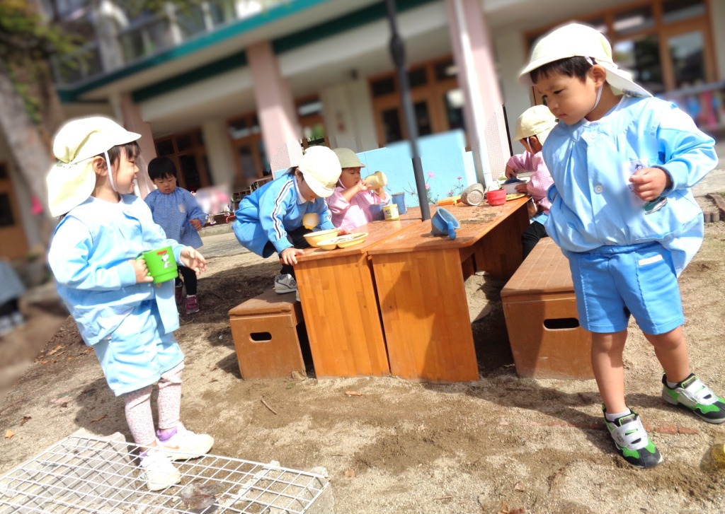葉っぱをお肉に、小石をじゃがいもに見立てて😉焼いて遊びました。