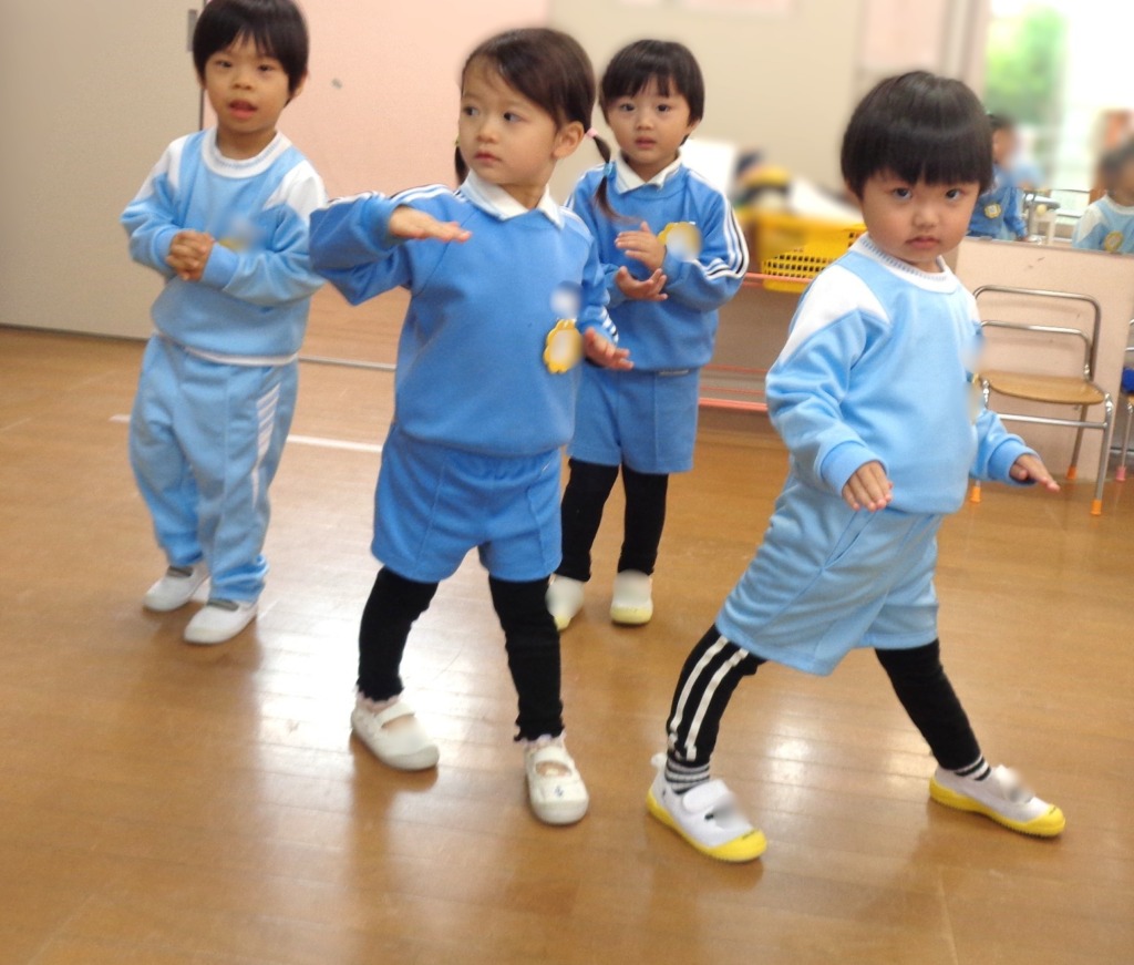 今日は少し難しくして、忍者歩き→手裏剣投げのポーズでストップ!をしてみました。