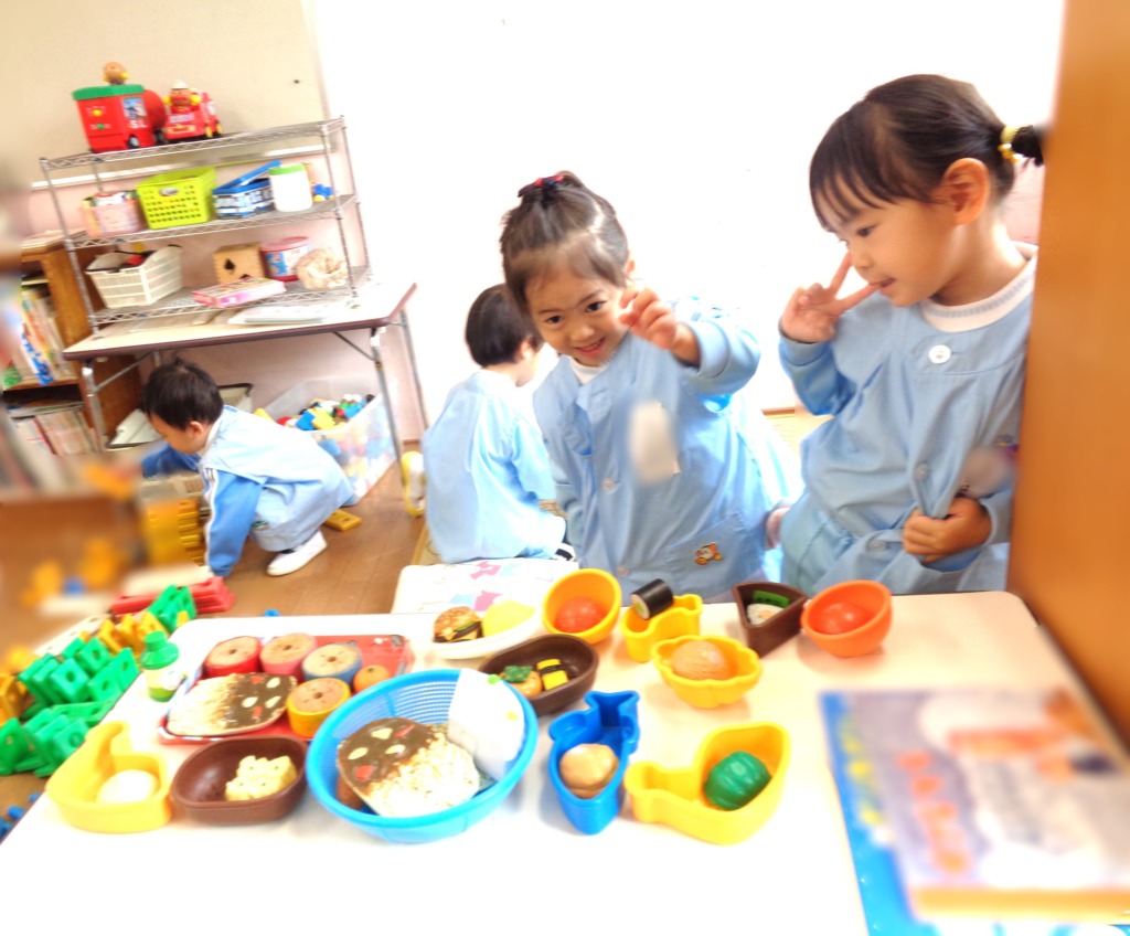 おしゃべりして、自由遊びはおままごとやブロックで遊んでいました。