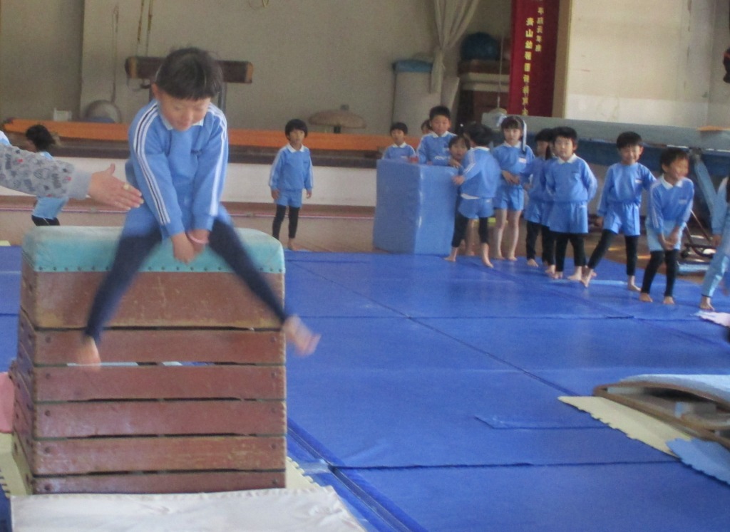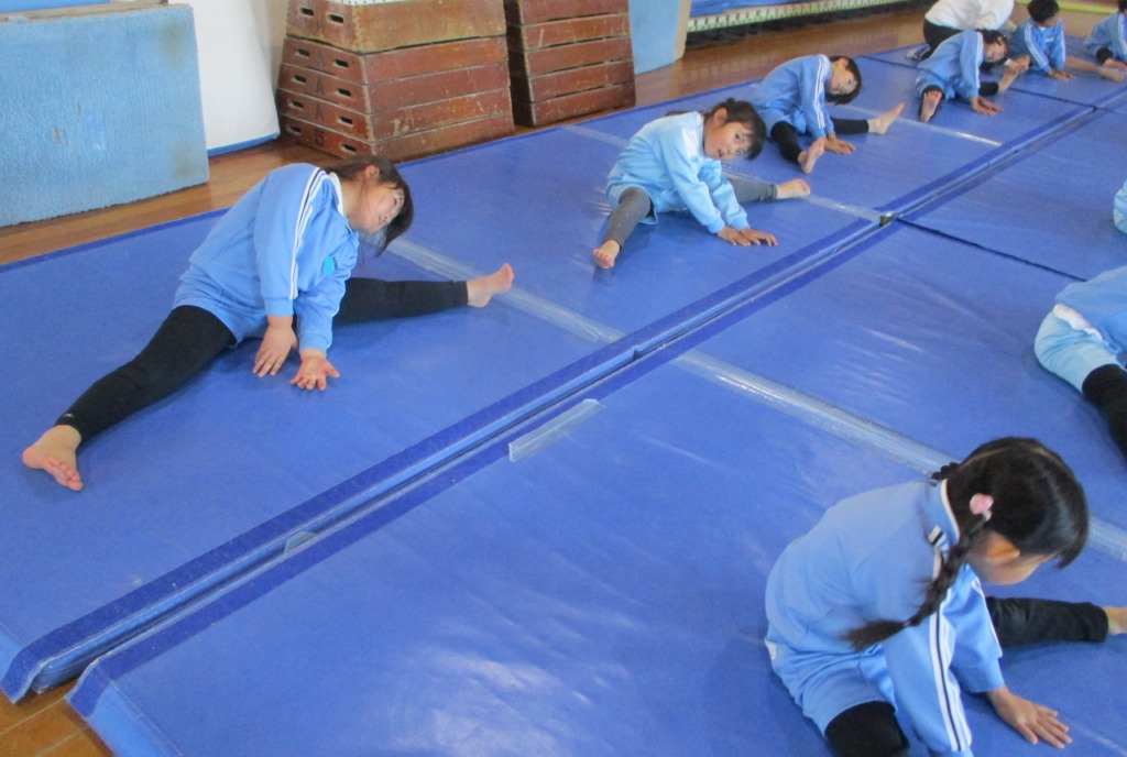 リズム室ではしっかり柔軟を行い跳び箱に挑戦していました。