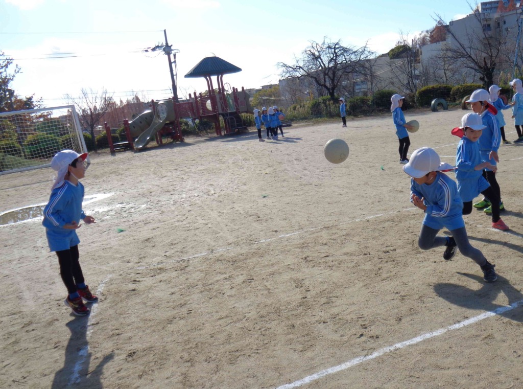 年長組がボールを使ってドッジボールをおこなっていました(*^_^*)ルールを確認したり、少人数で練習したり楽しんで取り組んでいました♬