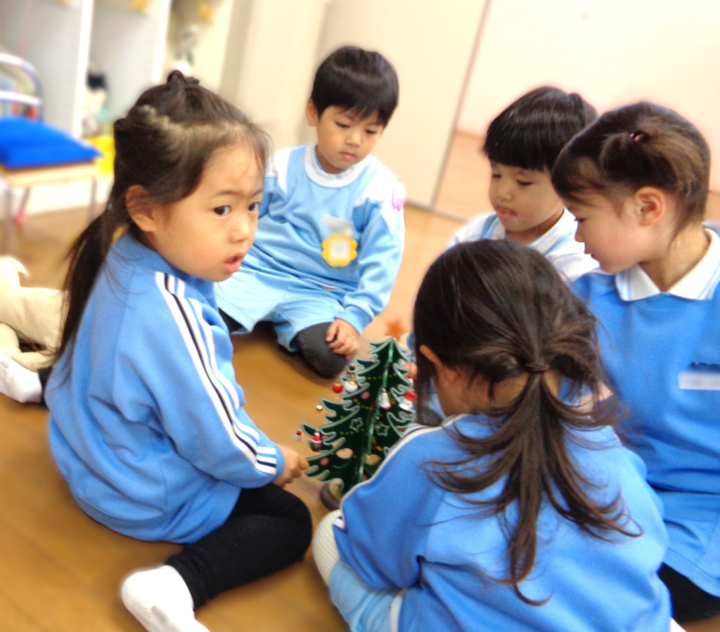 アドベントカレンダーのクリスマスツリーの飾りつけ楽しむ子ども達。