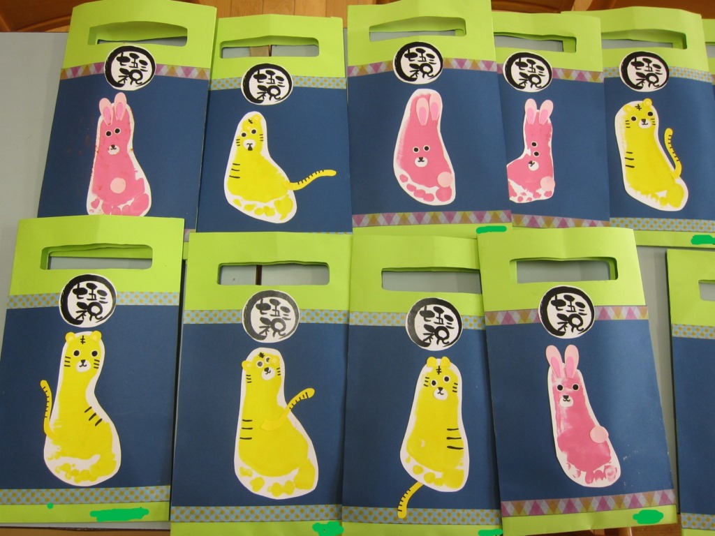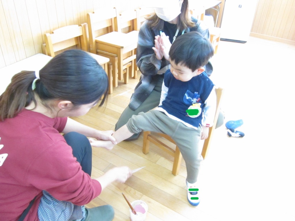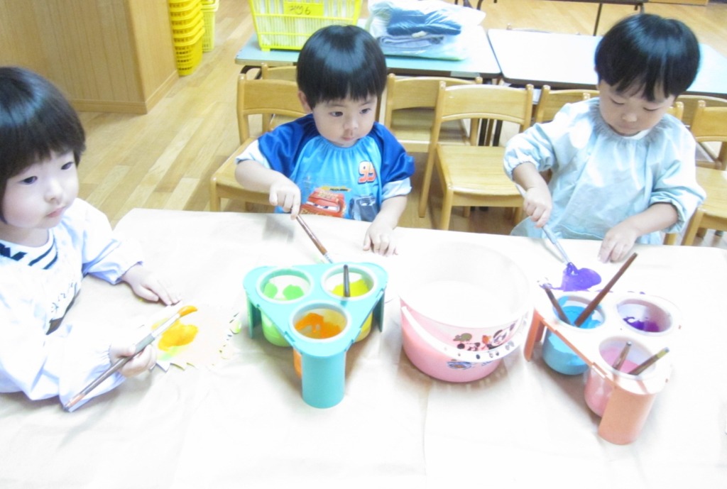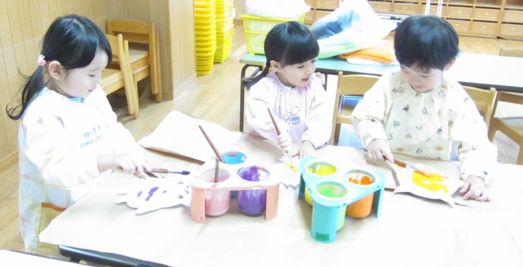 モンスターのお面作りです。絵の具で塗ると…色が混ざって違う色になることも、面白かったです!