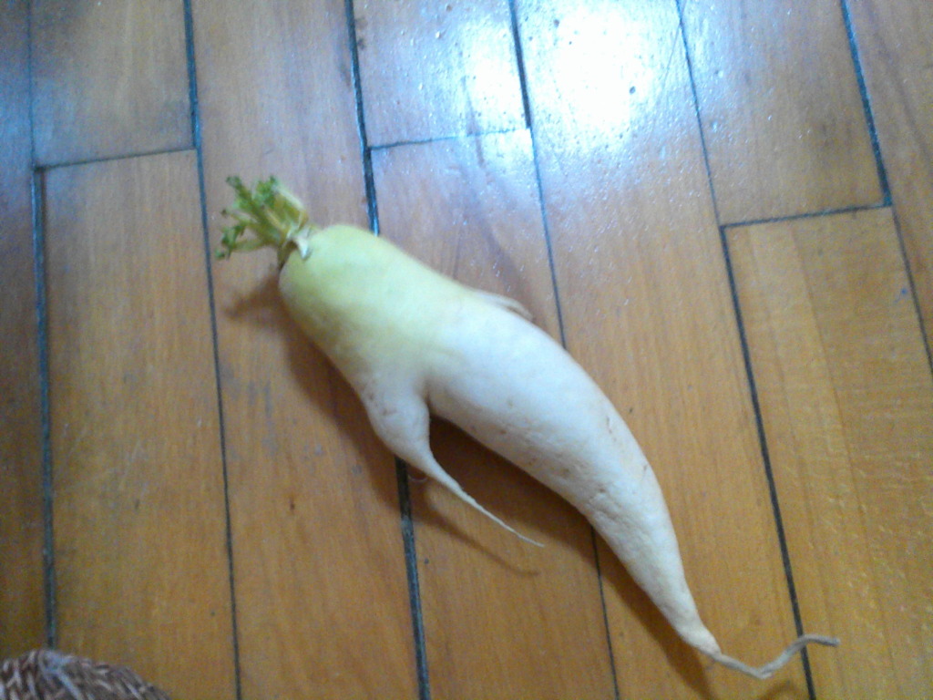 とある畑でとれた、おもしろい形の大根を見て
