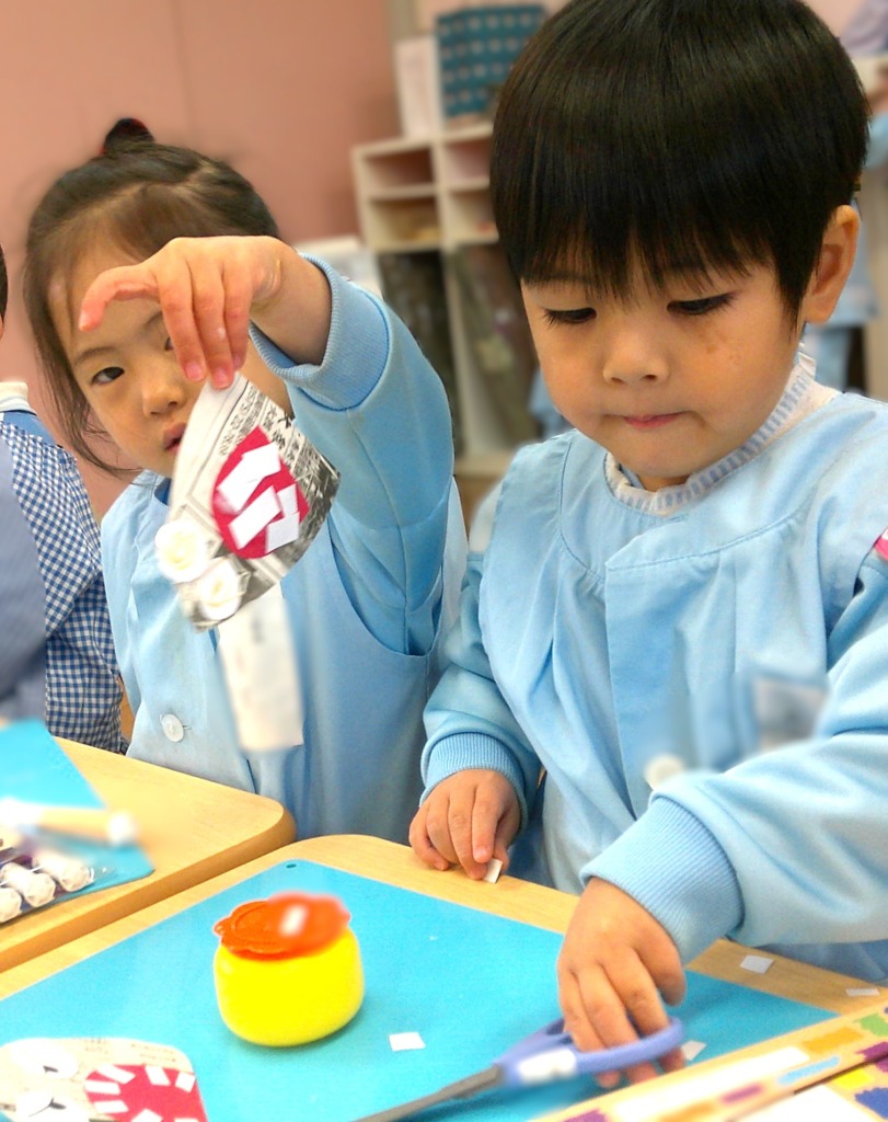 目や口をのりで貼って、歯はハサミで一本ずつ切りました!