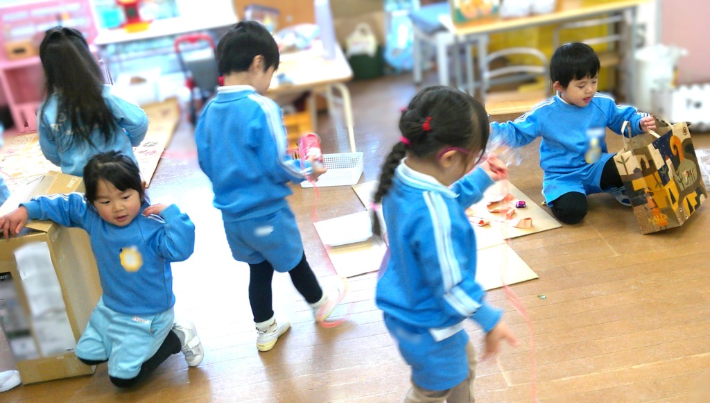 段ボール箱やお菓子の箱、きれいなリボンに大興奮でした!