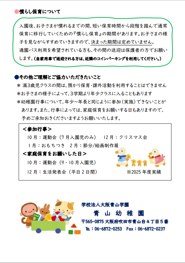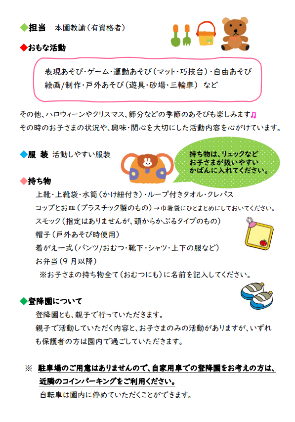 未就園児親子教室「青葉の会」については、(水・金)コースに若干の空きがございますのでお問い合わせください。