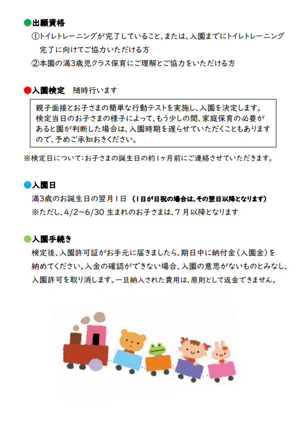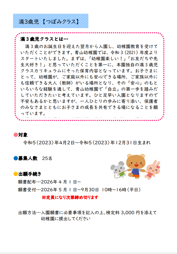 満3歳児クラスについては、4月1日~入園願書を配布いたします。