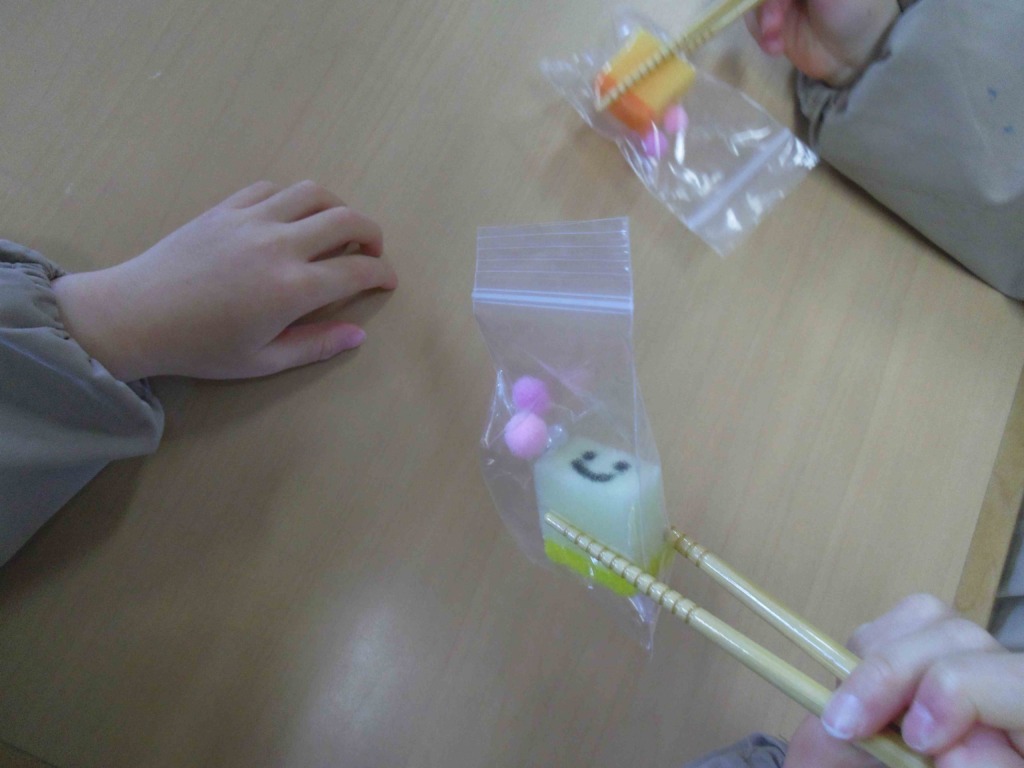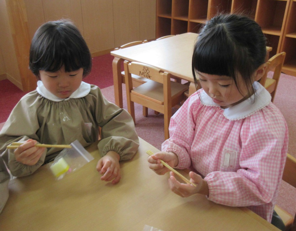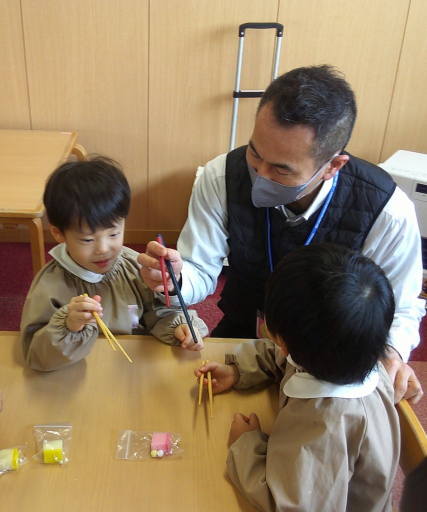 年中組が「お箸とえんぴつが正しく使えるお箸の教室」に参加しました💡お箸の先生に持ち方などを習いました(*^-^*)教えてもらってからは持ち方が上手になり、色々な物をつまむことができていましたよ♬