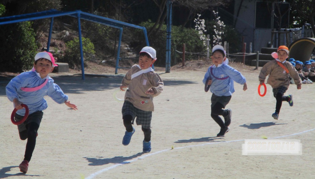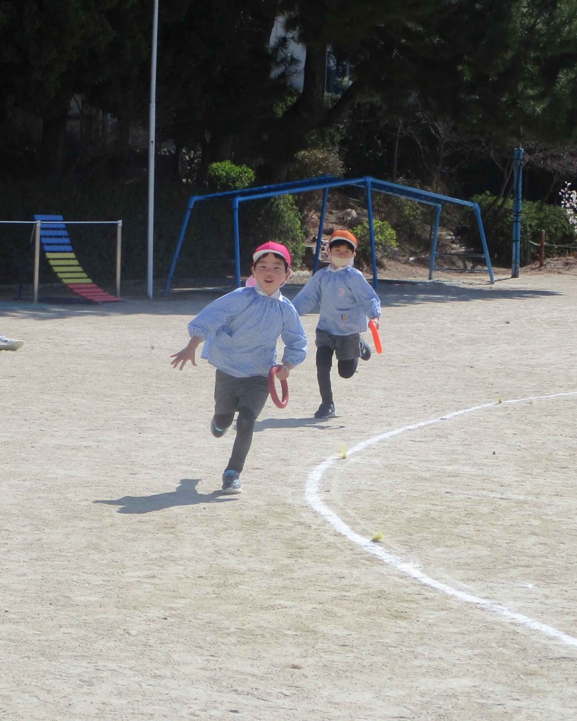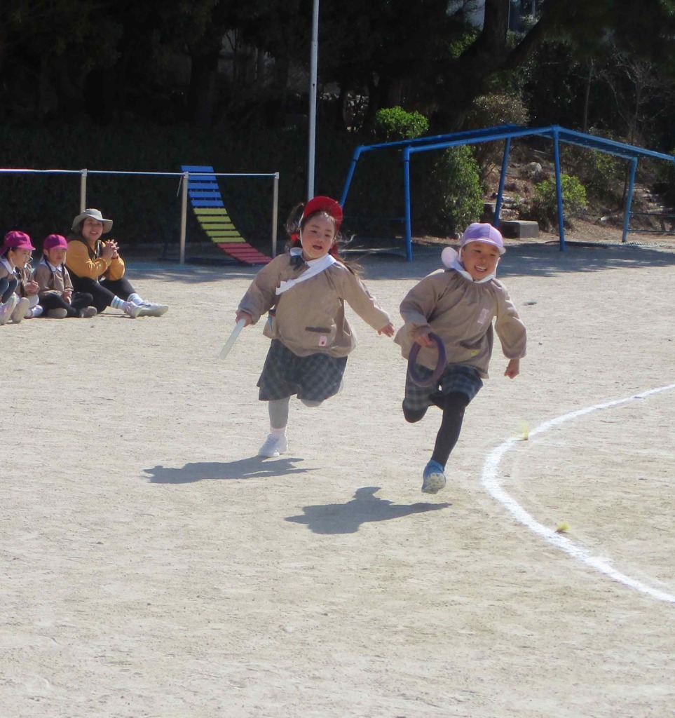 みんなで遊んだ後は年長組のリレー!!運動会の頃より走るのが速くなっていた子どもたち!周りにはそれを見守る年中・年少・つぼみクラスの子どもたち💡みんなで盛り上がりました(≧▽≦)