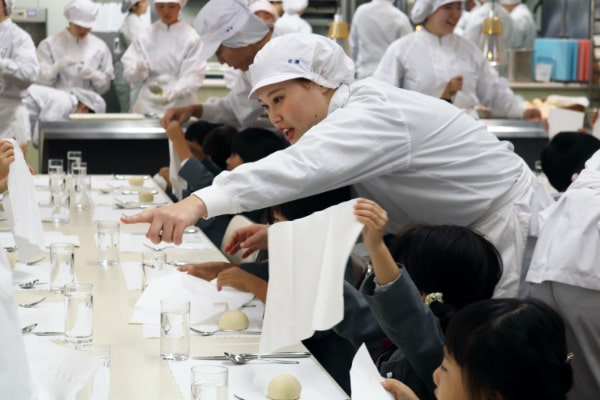 保育士・教員をめざす子ども教育学科の学生が最初に実習に訪れるのが附属園である本園です。管理栄養士をめざす健康栄養学科の学生は、園児らを大学に招いてテーブルマナー講習を実施。学生らが本格的なコース料理を作り、園児たちに食べ方のマナーや食材についてレクチャーします。今後は、看護師をめざす看護学科の学生による歯磨き・衛生指導の実施など、さらなる連携強化を見据えています。