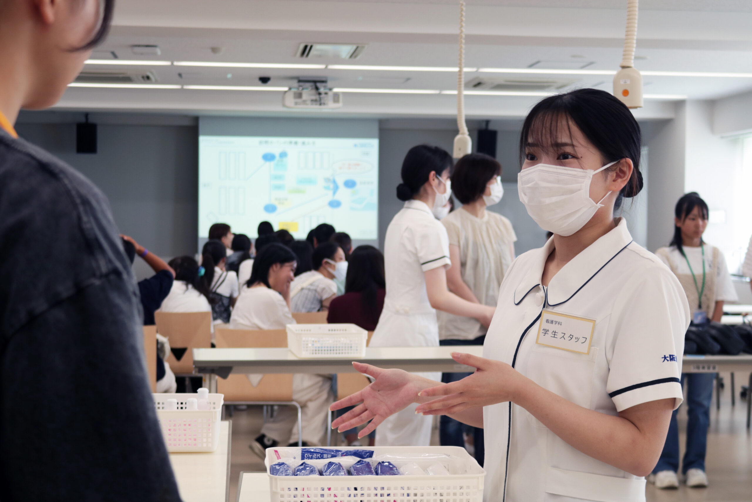 | ミニ講義「訪問看護師の活動を実際に体験してみよう!」 訪問看護師の仕事を知っていますか? 実際の地域・在宅看護活動において、訪問看護師はどのようなものを準備し、どのような流れで看護を行っているのでしょうか。 地域で暮らす療養者の看護の実施に向けて準備する看護物品や備品について、訪問鞄のセッティング体験を通して学びましょう。 | ![]() |
