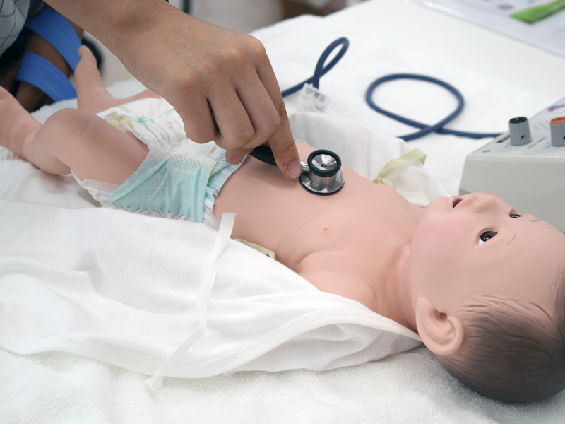 「妊婦や新生児の看護を体験してみよう!」 妊娠の経過と胎児の成長過程についてミニ講義をします。講義の後は、妊婦体験ベストを装着したり、妊婦の腹部モデルで胎児の大きさや向きを考えたりしてみましょう。聴診器で新生児の呼吸音や心音を聞く体験にもぜひ挑戦してください。 | ![]() |